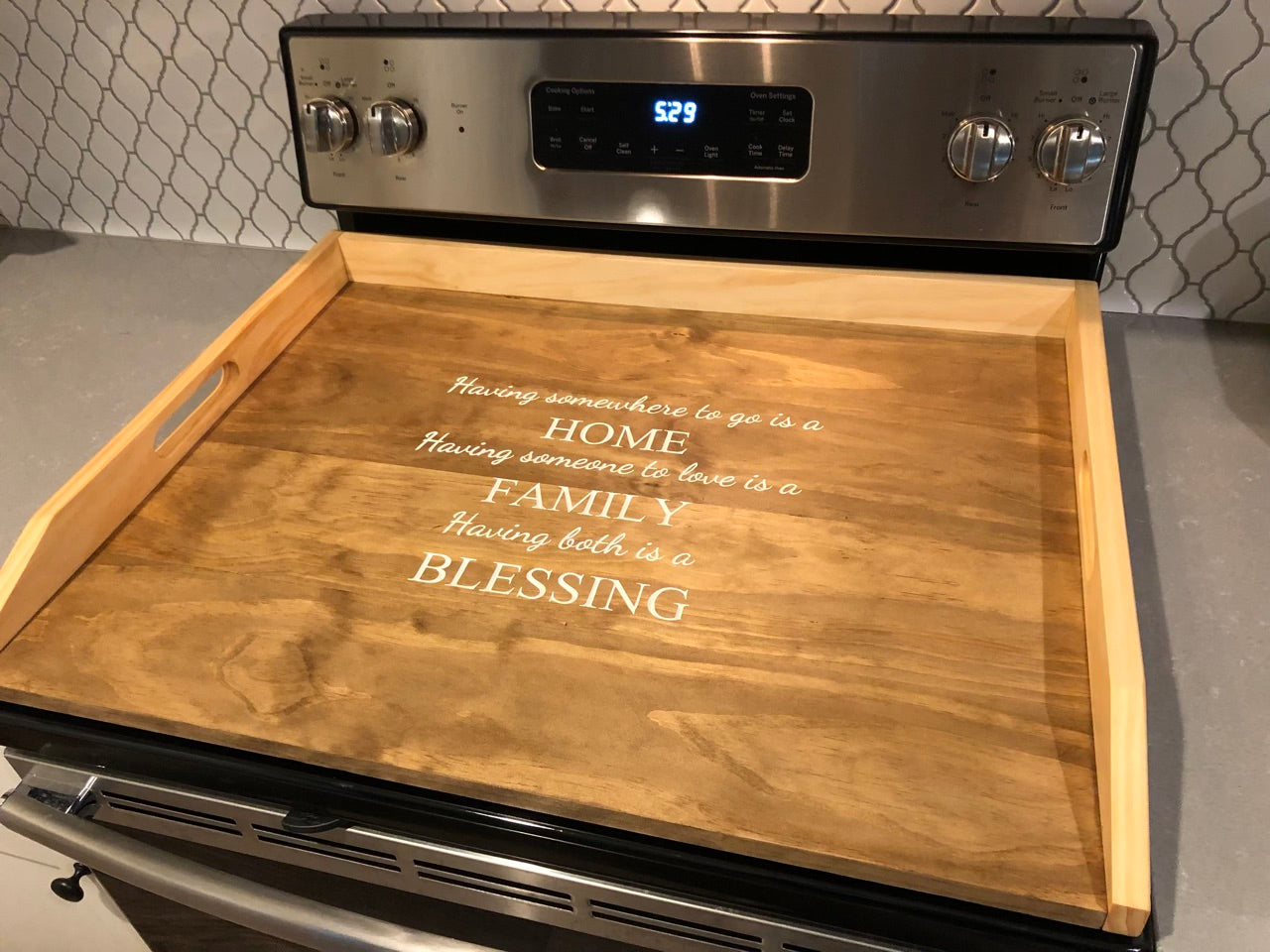 This cover is for decor purposes only, do not use on a hot stove. Always allow your stove to cool before placing on top. Please note that these products are not intended to be used as a cutting board; they are not food-grade safe and as such should be used for no other purpose than storage / decoration.