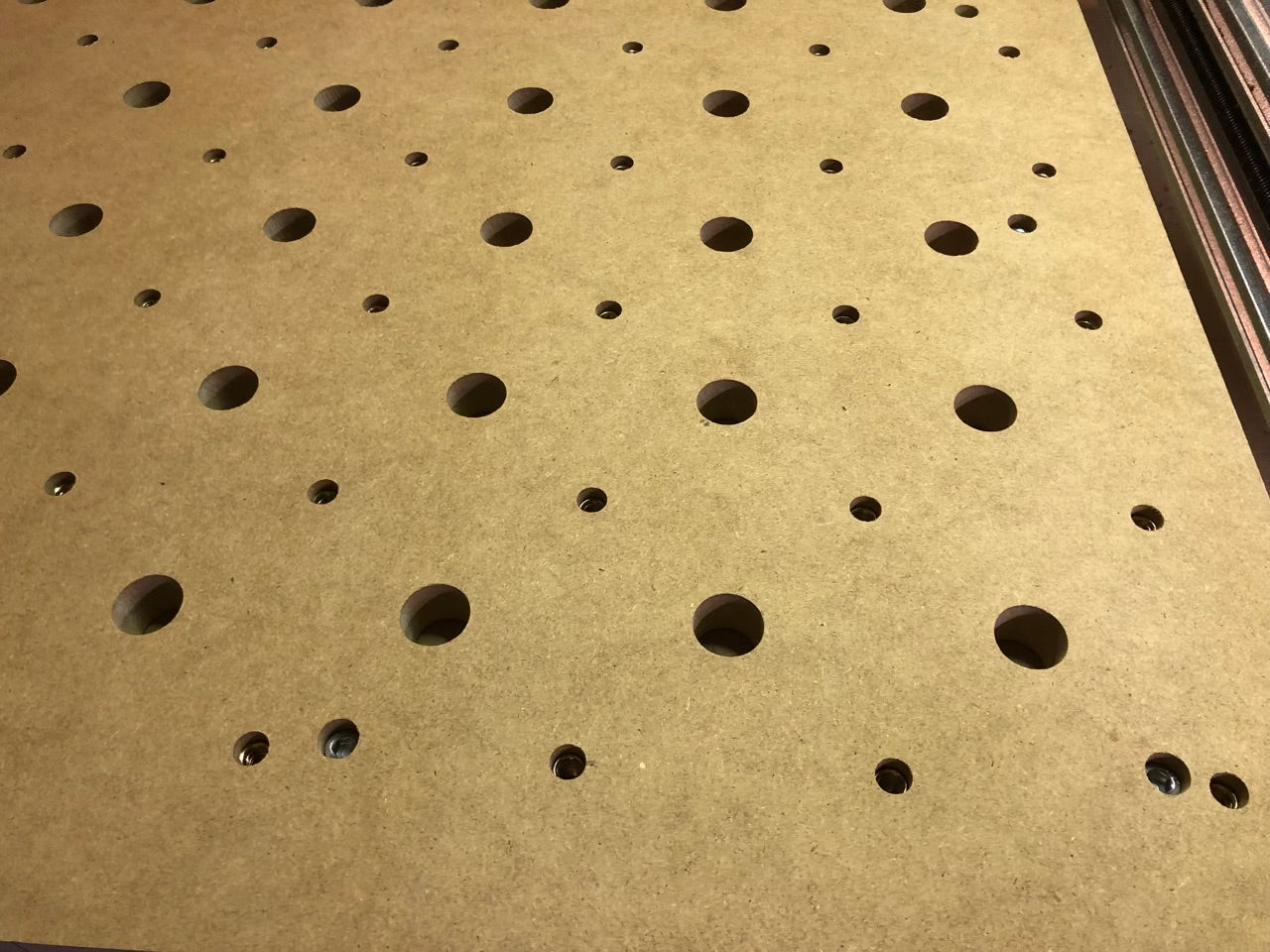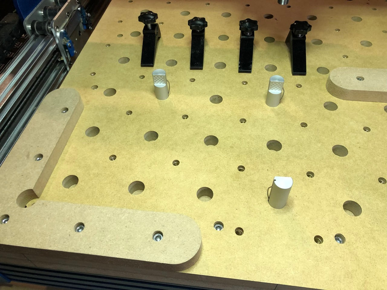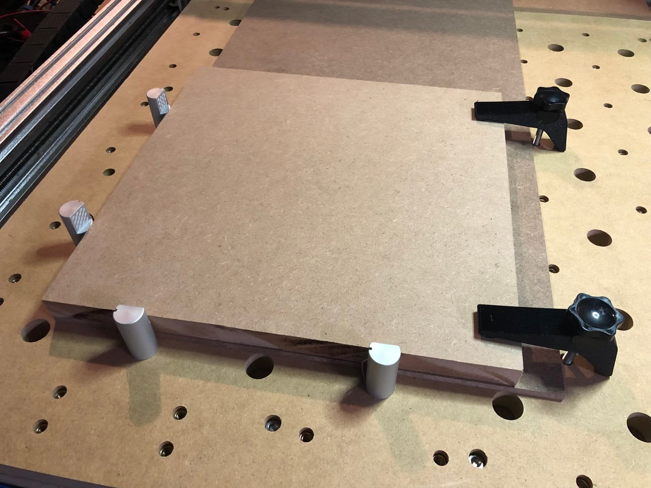 It features a base board which mounts directly to the front and rear rails using pre-exisiting holes. Threaded M6 holes to attach the spoil board. A spoil board with M6 threaded holes and bench dog holes which you can use with your favorite clamps or bump stops. Each hole type is 78mm on center in both the X and Y axis so you can freely rotate your clamps or jigs to meet your needs. An XY bracket design is also included which mates up to the hole pattern so your can reference your work anywhere on the bed.