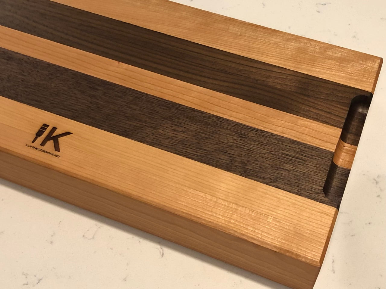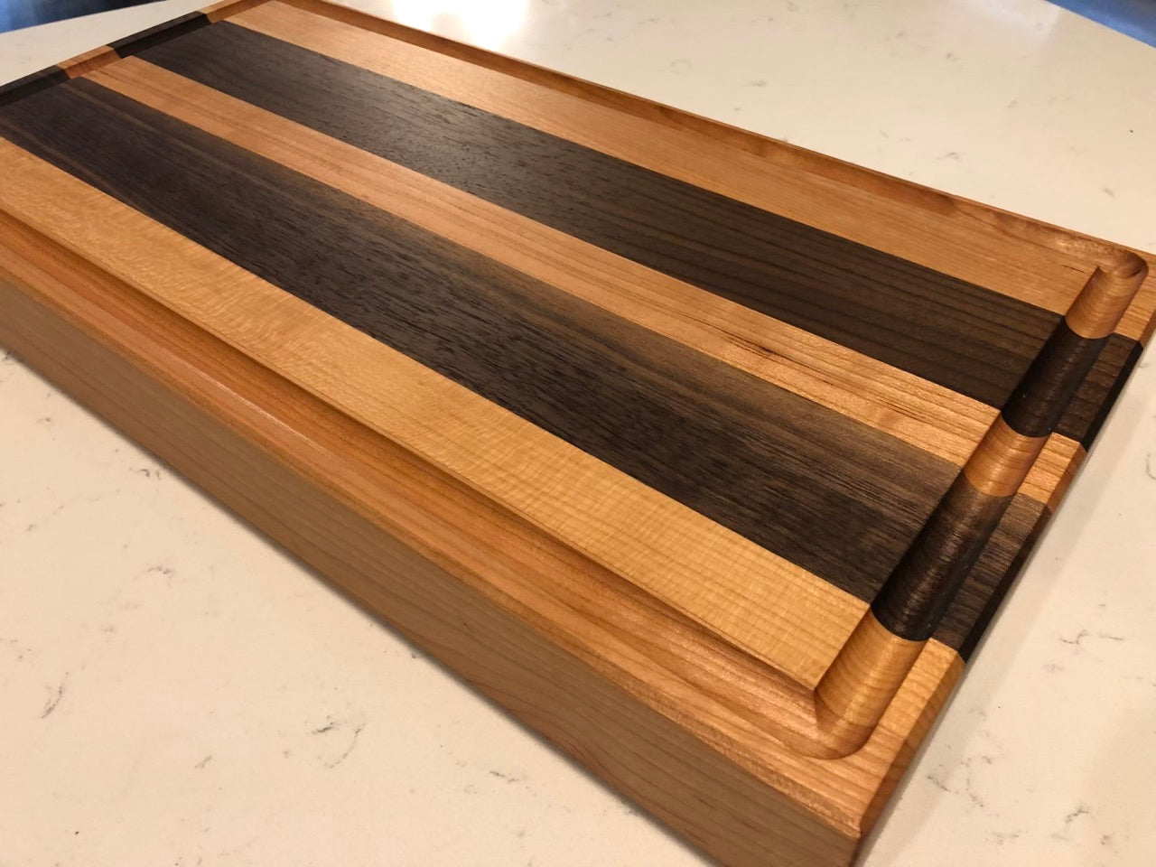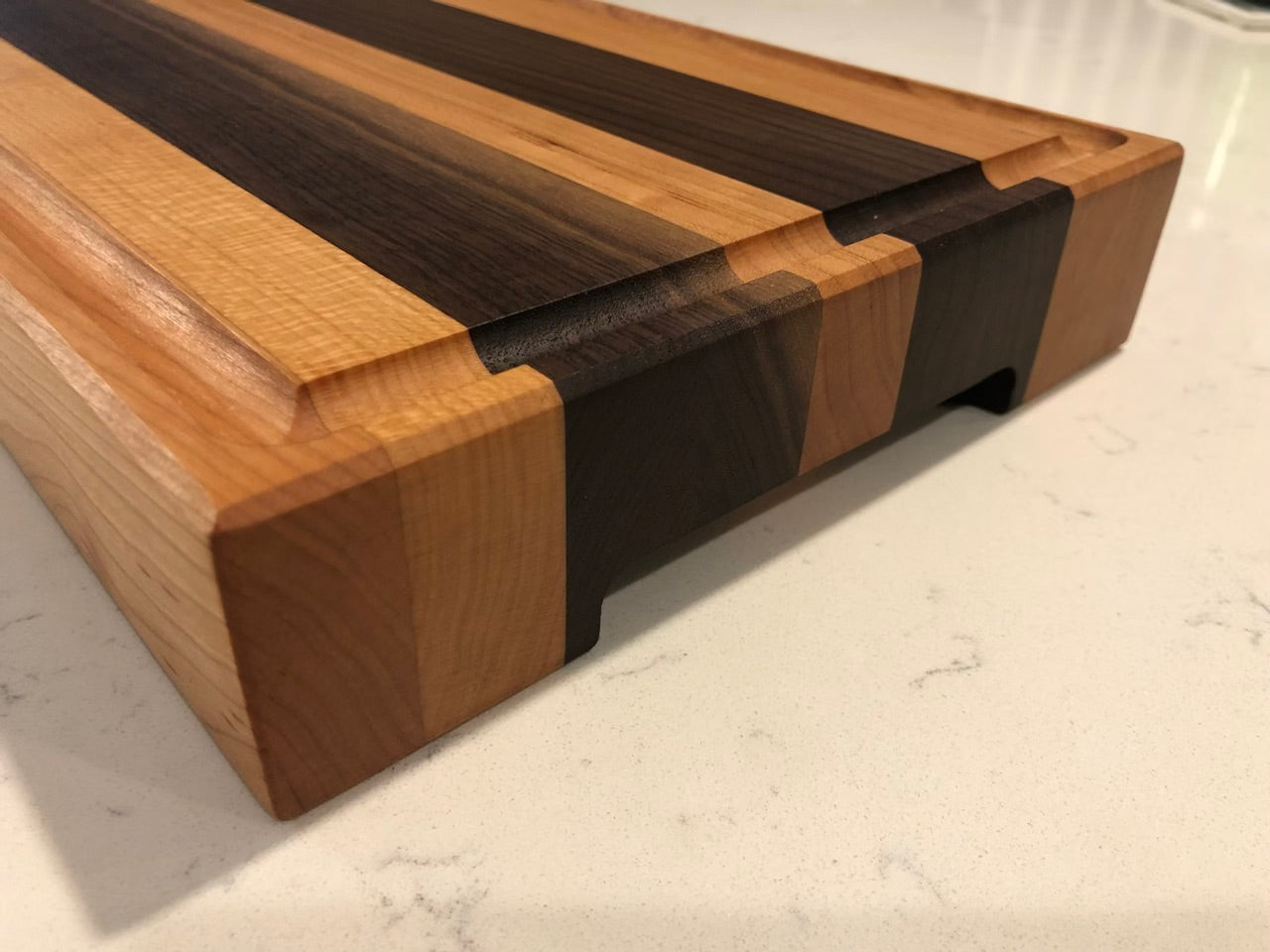 Hand made cutting board made from premium hardwoods. This is a thick edge grain cutting board made from Walnut and Cherry hardwoods.