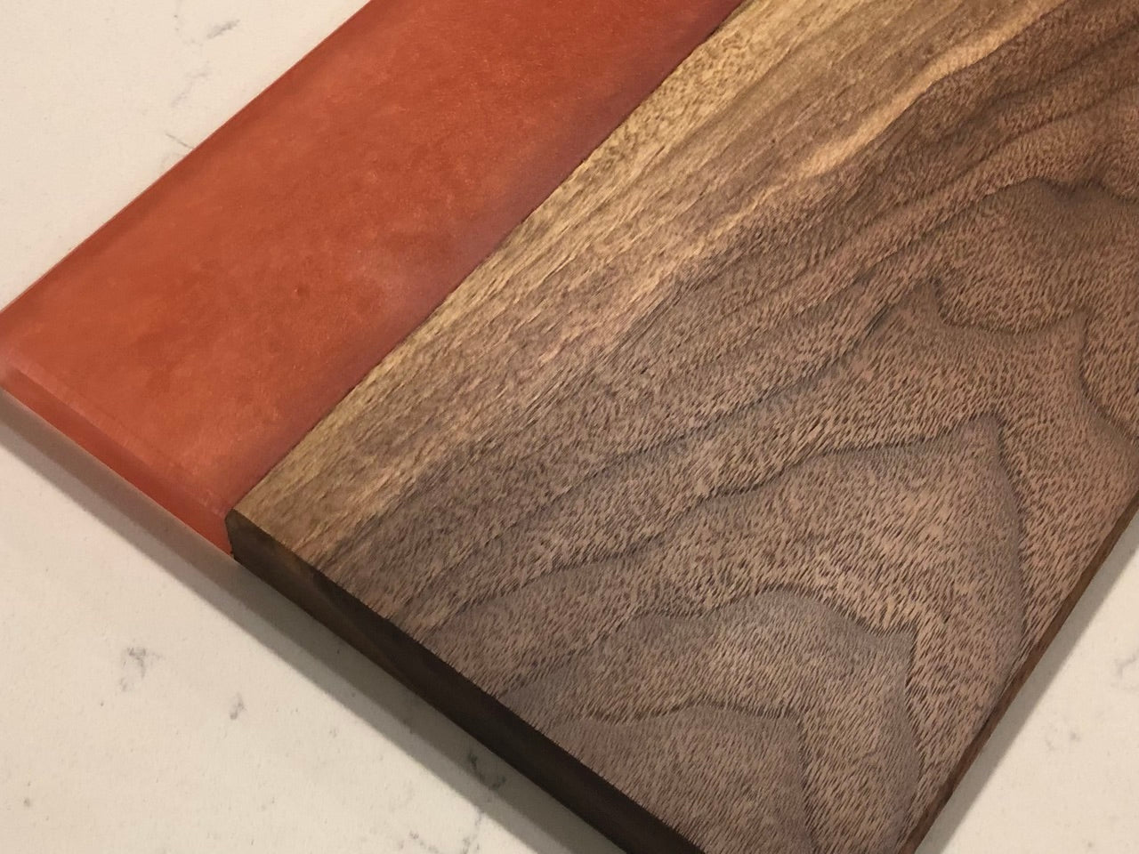 Hand made light magenta epoxy resin serving board made with premium walnut hardwood.